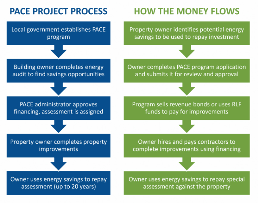 Property Assessed Clean Energy, or PACE, is a financing mechanism that enables low-cost, long-term funding for energy efficiency and renewable energy projects. PACE financing is repaid as an assessment on the property's regular tax bill, and is processed the same way as other local public benefit assessments.